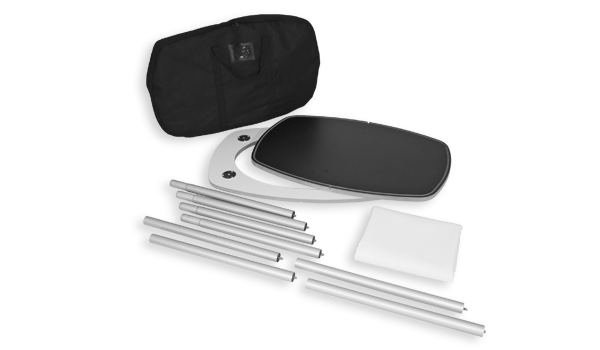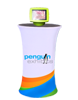 Our modern, eye-catching kiosks, branded with custom graphics will attract more attention to your booth. This product is constructed with an aluminum frame, wooden counter and bases, durable plastic  and tensioned fabric dyesublimation graphics. This product was designed to be lightweight and portable.
