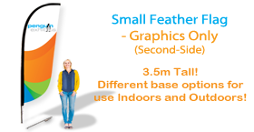The Small Feather Flag is 3.5 meters in height and can be purchased separately as hardware (pe-smff) or single-sided graphics (see product pe-smffg) or double-sided graphics (see product pe-smffg2).