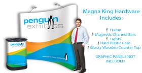 The 8ft Curved Magna King is the perfect solution for your next trade show or exhibition. This lightweight and compact kit makes for easy travel and transportation. The magnetic pop-up display snaps together in minutes. Magnetic channel bars simply snap onto the frame, holding the graphics securely in place. Each unit includes a roto moulded case and glossy black wood countertop. This kit also includes two 200-watt halogen lights. This product is constructed with an aluminum frame, steel magnetic bars.