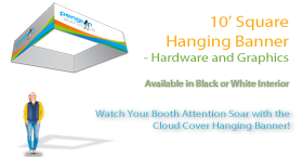 Get your name up in the clouds with the 10ft Square Cloud Cover (height 48"). This hanging sign will get you noticed from practically anywhere in the exhibit hall. Each cloud cover is constructed of a high quality frame and fabric graphics. This product includes both hardware and graphics resulting in a 10% discount. This product is constructed with an aluminum frame, bungee cord and push clip connectors with tensioned fabric dyesublimation graphics.