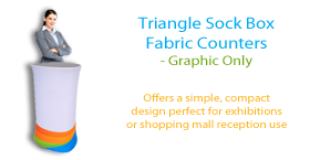 This product is graphics for the Triangle Sock Box Fabric Counter (product sb-trih). This product is constructed with an aluminum frame, wooden tops and bases and tensioned fabric dyesublimation graphics.