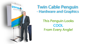 Our Standard Twin Graphic Cable Penguin is perfect for trade shows, exhibitions, store openings, specials or any event that needs a bold statement. The Standard Twin Graphic Cable Penguin is 86.25” high and is available in 4 widths from 27.5" to 39.4". Each unit includes a convenient, compact transport case. This product includes both hardware and graphics resulting in a 10% discount.