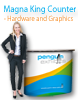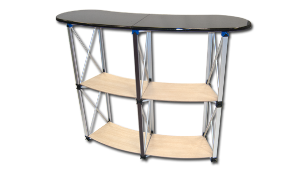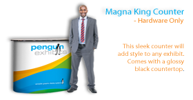 Add an attractive and functional workspace at any trade show, exhibition or special event with the Magna King Counter. Set-up in just minutes with the pop-up collapsible style frame. Magnetic channel bars simply snap onto the frame, holding the graphics securely in place. The internal shelves provide valuable storage and the glossy black countertop is ideal for displaying your literature, products and more. This product is constructed with an aluminum frame, steel magnetic bars and hydrosol graphic panels.